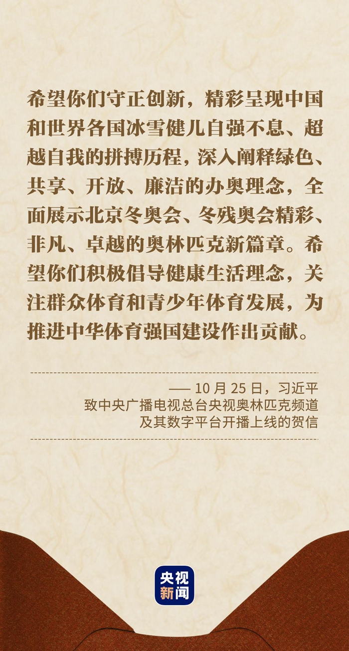 从中央广播电视总台央视奥林匹克频道及其数字平台开播上线到中国人民对外广播事业创建80周年,从首届中国网络文明大会到第130届中国进出口商品交易会,从2021年世界互联网大会乌镇峰会到首届北斗规模应用国际峰会……总书记的一封封贺信,站位高远、内涵丰富,意义重大、字字千钧,体现了人民领袖对各行各业的亲切关怀和殷切期望,擘画了新征程的发展蓝图。