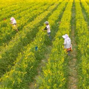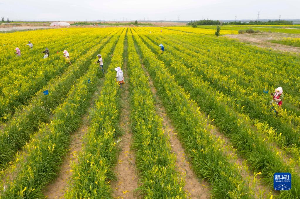 在宁夏吴忠市红寺堡区柳泉乡柳泉村,村民在采摘黄花菜(无人机照片,2020年7月11日摄)。新华社记者 杨植森 摄