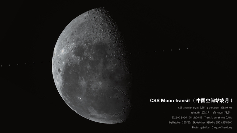 “和平常拍空间站过境不同,拍摄‘凌月’‘凌日’,是为了更好捕捉到空间站细节画面”,北京天文馆研究员朱进介绍,在月面和日面的映衬下,空间站轮廓能更加清晰。