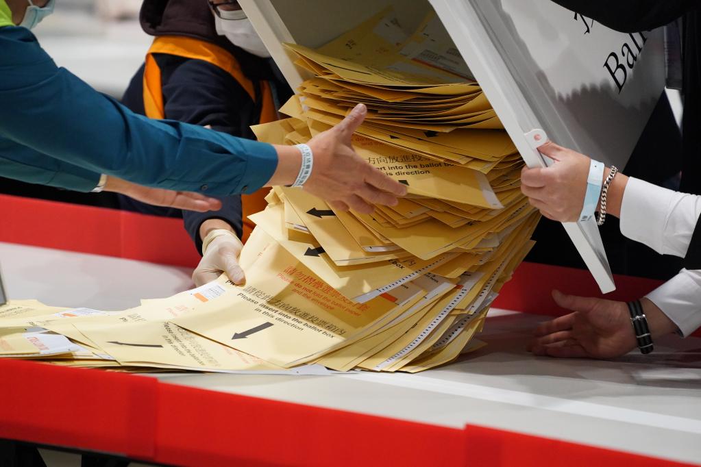 12月19日,香港顺利举行完善选举制度后首次立法会选举投票,工作人员点票现场。新华社记者 吕小炜 摄