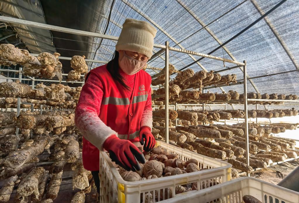陈璠萍正在香菇种植大棚里整理采摘好的香菇。新华社记者 王铭禹 摄