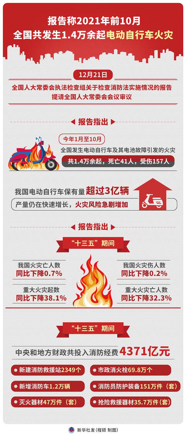 新华社北京12月21日电(记者刘夏村)21日,全国人大常委会执法检查组关于检查消防法实施情况的报告提请全国人大常委会会议审议。报告指出,今年1月至10月,全国发生电动自行车及其电池故障引发的火灾共1.4万余起,死亡41人,受伤157人。