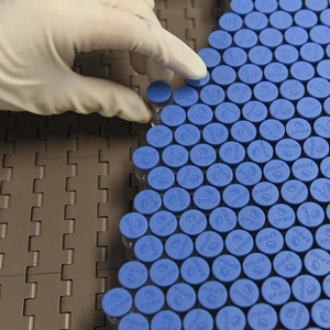 在安徽智飞龙科马生物制药有限公司新冠疫苗生产线上,工作人员将疫苗放入传送带(5月25日摄)。新华社记者 张端 摄