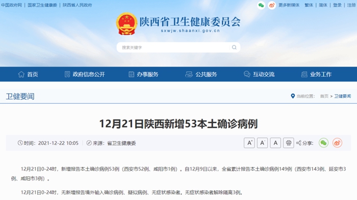 12月21日0-24时,陕西新增报告本土确诊病例53例(西安市52例、咸阳市1例)。自12月9日以来,全省累计报告本土确诊病例149例(西安市143例、延安市3例、咸阳市3例)。