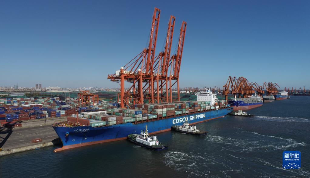 10月23日,一艘轮船在拖轮的协助下向唐山港京唐港区集装箱码头靠泊(无人机照片)。新华社记者 朱旭东 摄