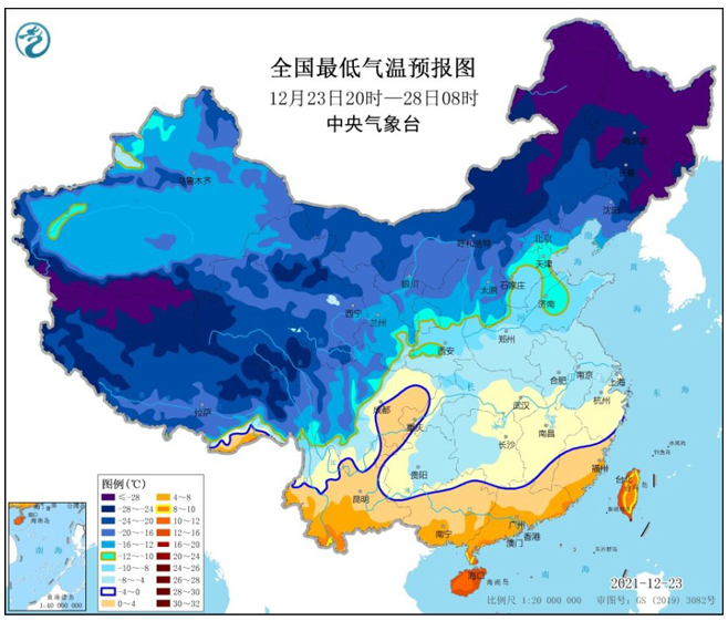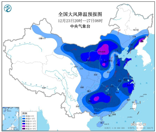 张芳华:预计12月23日夜间至26日,我国中东部大部地区将出现明显大风降温天气,内蒙古中西部、华北北部和西部、东北地区南部、黄淮东部、江淮东部、江南东部以及贵州东部、湖南西部等地的部分地区降温12~14℃,局地14℃以上;其中,23日至25日,长江中下游及其以北大部地区先后有4~5级风,阵风6~8级;气温普遍下降6~10℃,内蒙古中部、山西北部、河北西北部、辽宁东北部、吉林东南部以及山东半岛等地的部分地区降温12℃以上。28日前后,最低0℃线将位于江南南部至贵州南部一带。此外,23日夜间至27日,我国东部和南部海域先后有7~9级大风,阵风10级左右。