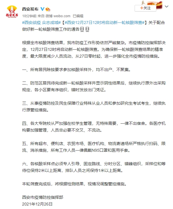 根据全市核酸筛查结果,我市防疫工作形势依然严峻复杂。市疫情防控指挥部决定,12月27日12时将启动新一轮核酸筛查。为确保新一轮核酸筛查结果的精准度,最大限度减少人员流动,从27日零时起,进一步强化全市疫情防控措施。