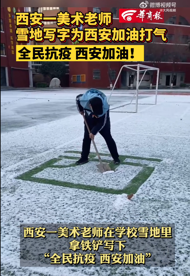 西安一美术老师在学校雪地里