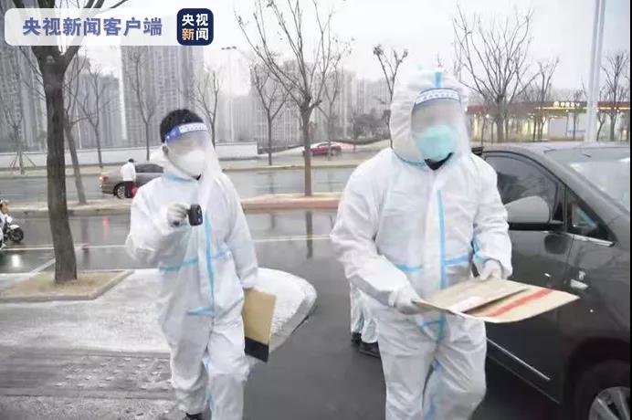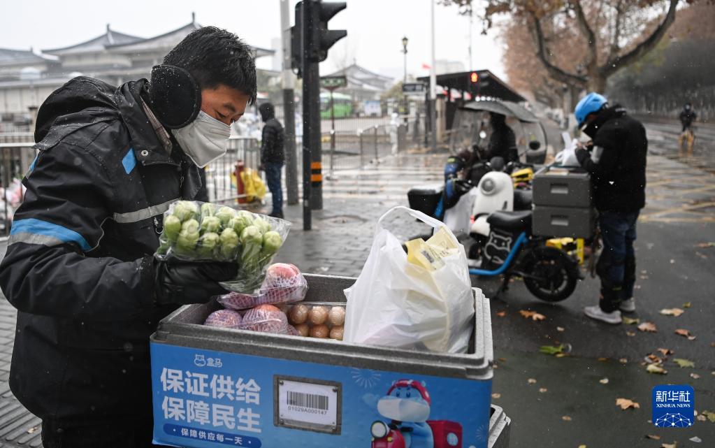 12月25日,外卖人员张欣(左一)在西安市小寨东路一封控小区配送蔬菜。这几天,他的业务量是平时的两倍。新华社记者 陶明 摄