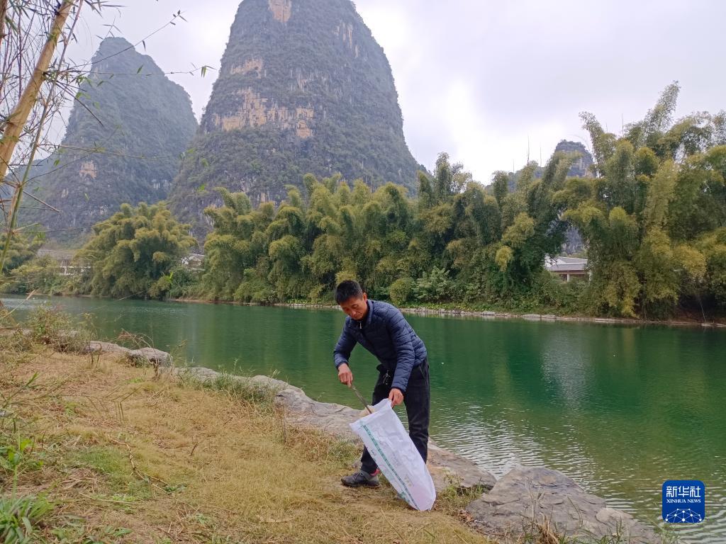 在广西阳朔县鸡窝渡村,河长徐文通在遇龙河畔捡拾垃圾(12月29日摄)。新华社发