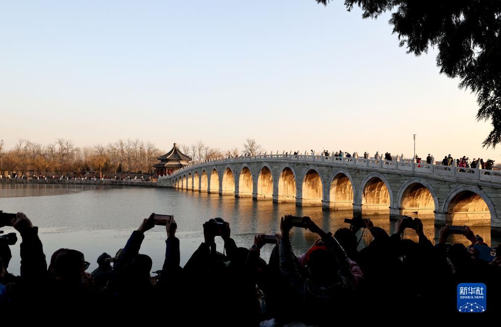 游客在北京颐和园南湖岛拍摄“金光穿洞”(11月25日摄)。新华社记者 陈建力 摄