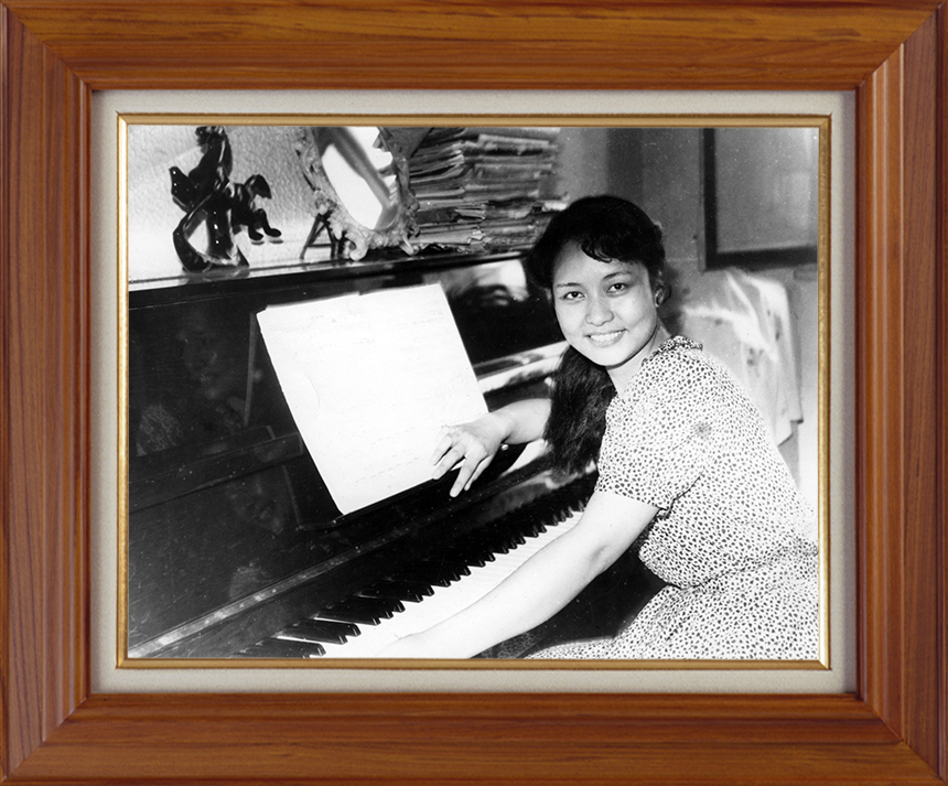 一张是彭丽媛年轻时坐在钢琴前的单人照。