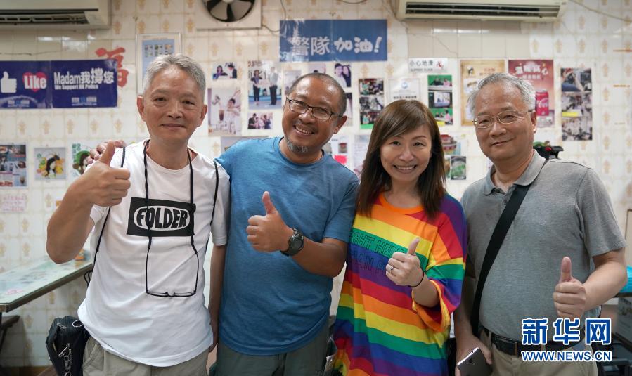 在观塘经营茶餐厅的香港市民李凯瑚(右二)与支持者合影(2019年8月20日摄)。新华社记者 李钢 摄