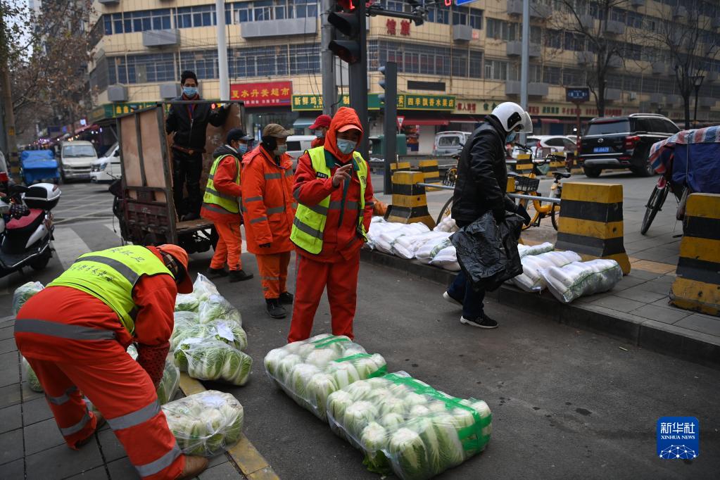 1月5日,西安碑林区环卫人员在搬运爱心人员捐赠的蔬菜。新华社记者 陶明 摄