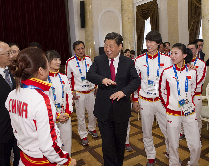 2014年8月15日,中共中央总书记、国家主席、中央军委主席习近平来到南京青奥会运动员村,亲切看望参加本届青奥会的中国体育代表团。新华社记者 马占成摄