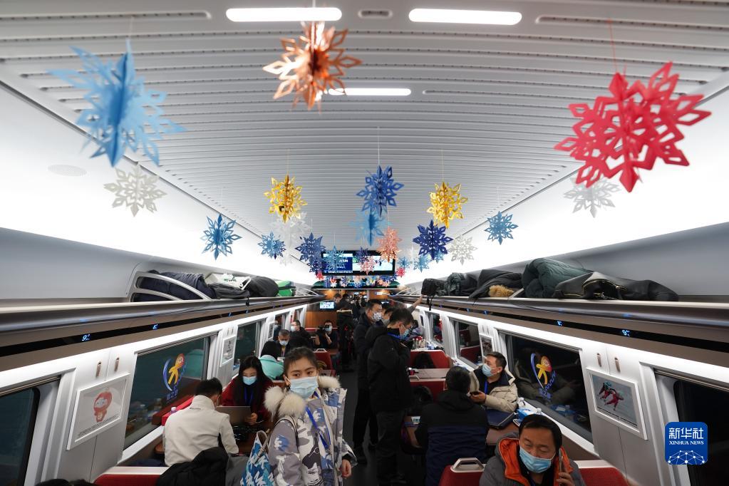 1月6日,在G9981次北京冬奥列车媒体车厢内,媒体记者在工作。 新华社记者 鞠焕宗 摄