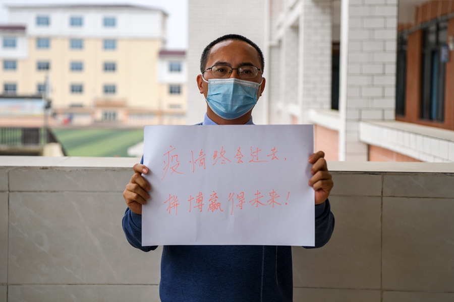 ↑东兴中学物理老师何赞为高三学生加油(1月5日摄)。