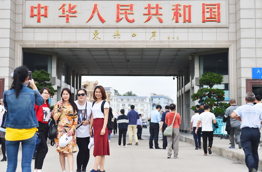 ↑这是往日繁华热闹的东兴市,游客在东兴口岸的国门前合影拍照(2019年3月21日摄)。