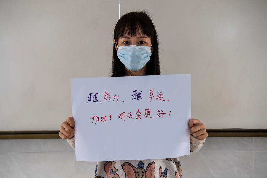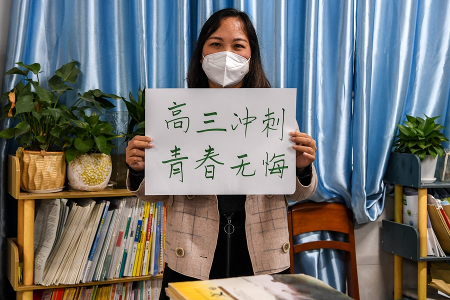 ↑东兴中学政治老师罗敏为高三学生加油(1月5日摄)。