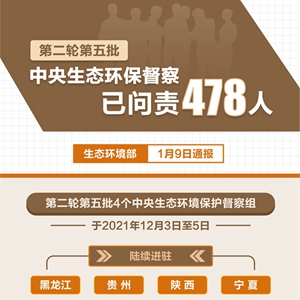 新华社北京1月9日电(记者高敬)生态环境部9日通报,第二轮第五批4个中央生态环境保护督察组于2021年12月3日至5日陆续进驻黑龙江、贵州、陕西、宁夏4个省(区)开展督察。截至2022年1月5日晚,全面完成督察进驻期间工作。各地已问责党政领导干部478人。