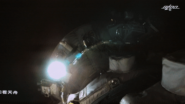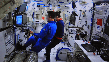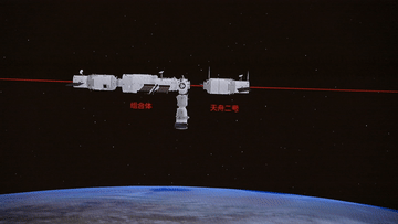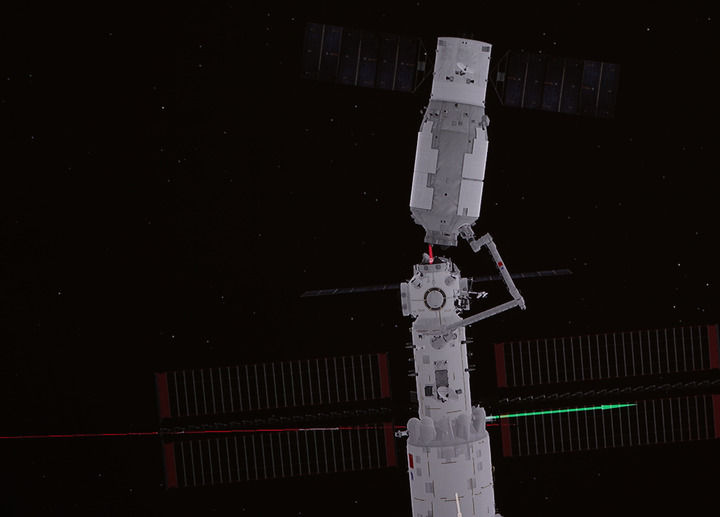天舟二号货运飞船在机械臂拖动下以核心舱节点舱球心为圆心进行平面转位。(新华社记者郭中正 摄)