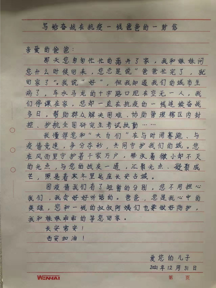 西安体育系统一位抗疫干部收到儿子的亲笔信