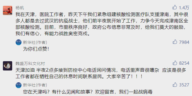 我是天津东丽人,我爸爸昨天晚上十点左右接到通知,开始联系单位的人员,到了半夜两点左右出去支援了,到现在还在津南区支援,我本人是大学生,希望能做志愿,为社区做出微薄贡献,我也相信天津再次上热搜将会是成功战胜奥密克戎!我们一起加油!!!