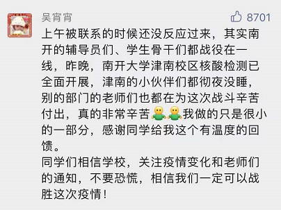 我在天津,爱人作为社区工作者,昨晚八点半回到岗位,一直工作到今天凌晨6点,早上八点又重新回到工作岗位,要布置社区的大筛,社区工作者很辛苦,希望大家在接下来的抗疫中,多多配合,谢谢!天津加油!