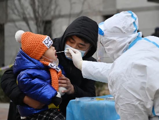 1月9日,在天津市西青区中北镇锦曦花苑社区一处核酸检测点,家长抱着孩子进行核酸检测。新华社记者李然摄
