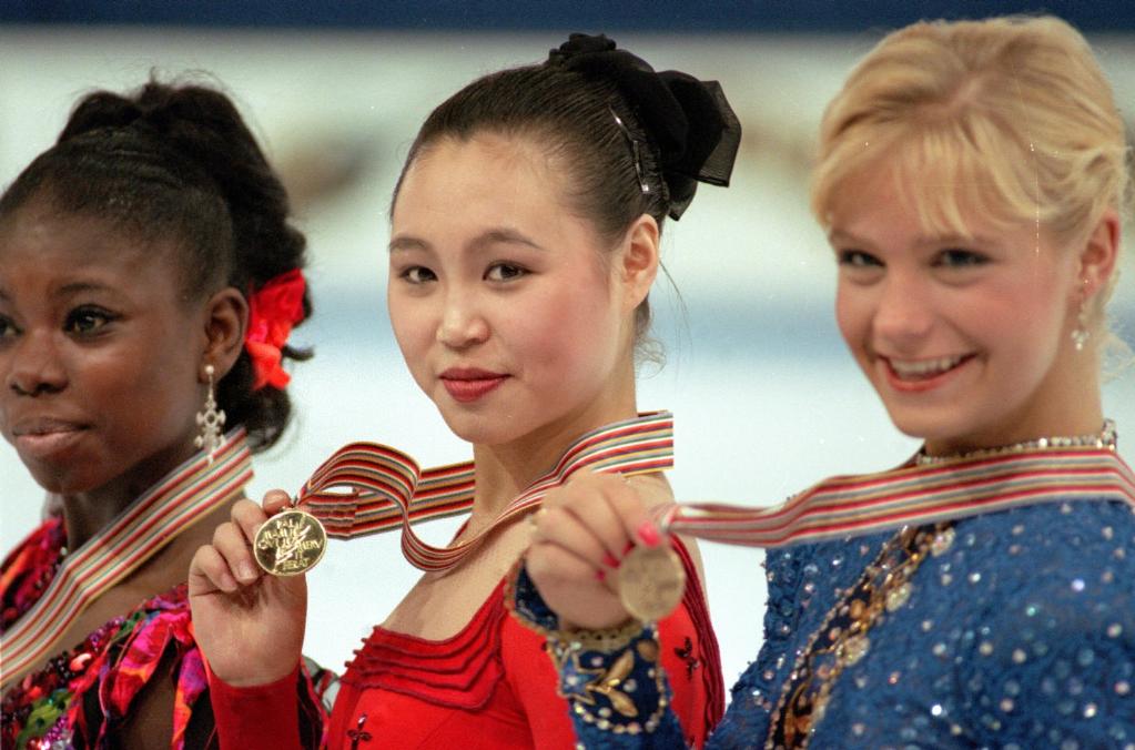 1998年2月20日,长野冬奥会花样滑冰女子单人滑三甲揭晓,美国选手利平斯基、关颖珊分获冠亚军,中国选手陈露(右)摘取铜牌。新华社记者陈建力摄(传真照片)