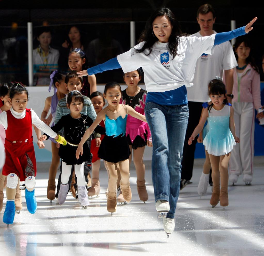 2007年4月24日,陈露(前)在北京举行的俄罗斯索契2014申奥宣传活动中为小朋友进行花样滑冰指导。新华社记者廖宇杰摄