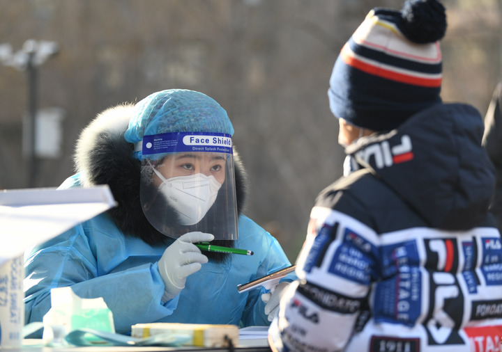1月15日,天津,工作人员正在进行核酸检测登记。(新华社记者孙凡越 摄)
