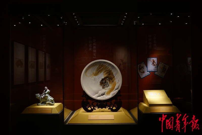 1月19日,北京,中国国家博物馆,“瑞虎佑安——二〇二二新春展”上展出的雄威舞骤雪·粉彩瓷盘(中)。