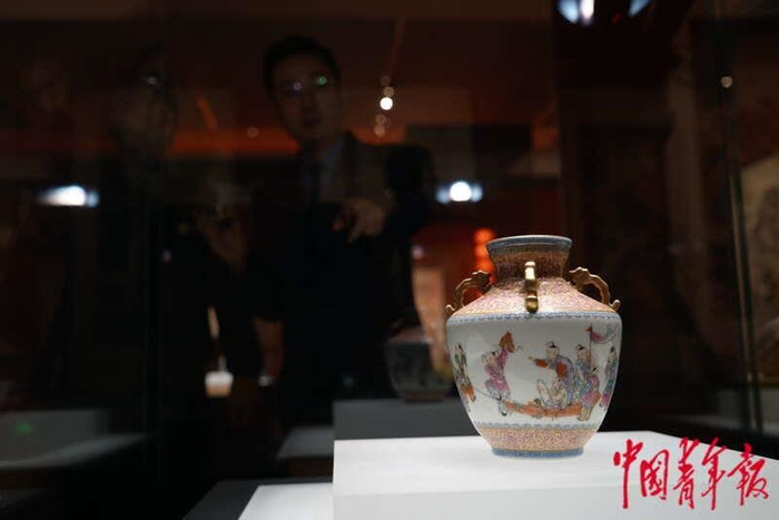1月19日,北京,中国国家博物馆,“瑞虎佑安——二〇二二新春展”现场,工作人员介绍清嘉庆年间的粉彩描金婴戏图·四螭耳尊。