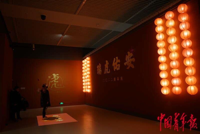 1月19日,北京,中国国家博物馆,“瑞虎佑安——二〇二二新春展”上,一名工作人员正在展览入口处测试现场的互动体验装置。