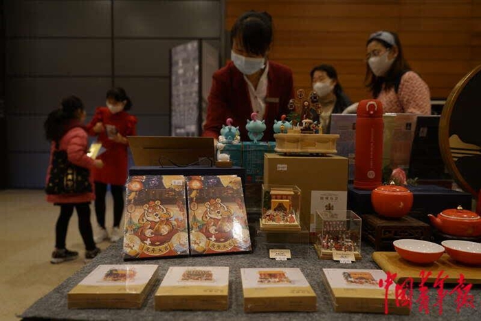 1月19日,北京,中国国家博物馆,展厅门外,工作人员正在售卖国博文创产品,虎年的文创产品已经摆出。