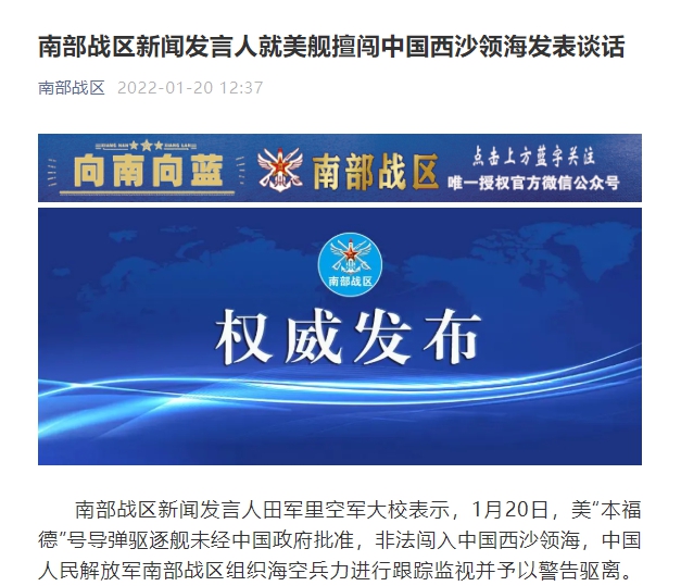 南部战区新闻发言人田军里空军大校表示,1月20日,美“本福德”号导弹驱逐舰未经中国政府批准,非法闯入中国西沙领海,中国人民解放军南部战区组织海空兵力进行跟踪监视并予以警告驱离。美方行径严重侵犯中国主权和安全,是其大搞航行霸权、制造南海军事化的又一铁证,事实充分证明,美是不折不扣的“南海安全风险制造者”,是南海和平稳定的“最大破坏者”。我们严正要求美方立即停止此类挑衅行径,否则将承担由此引发不测事件的严重后果。战区部队时刻保持高度戒备状态,采取坚决行动,捍卫国家主权安全和南海地区和平稳定。