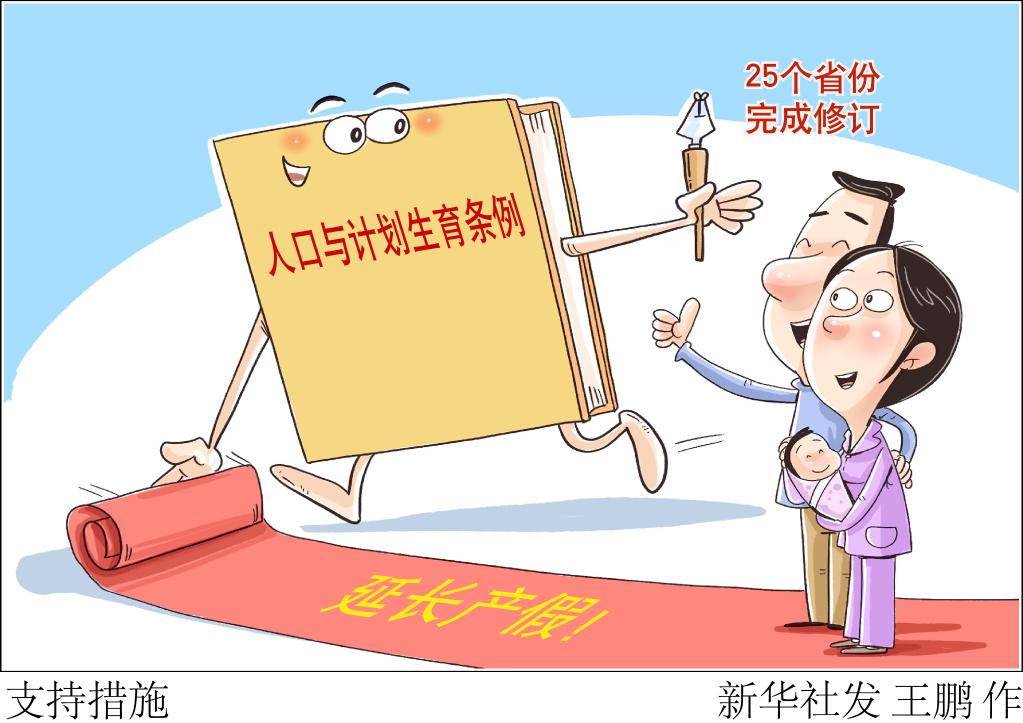 一些地方推出了符合本地实际情况的生育支持举措。例如,修改后的《浙江省人口与计划生育条例》规定,女方在享受国家规定产假的基础上,生育一孩延长产假60天,生育二孩、三孩延长产假90天;江苏省苏州市对已备案的社会办普惠性托育机构,给予1万元/托位的建设资金补助和300-800元/人/月的托位运营补助;四川省攀枝花市在全国率先推出育儿补贴金政策……