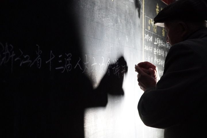 陈立勋老人正在将浙江省两会召开的消息抄写到黑板报上。图片均由新华每日电讯记者崔力 摄