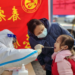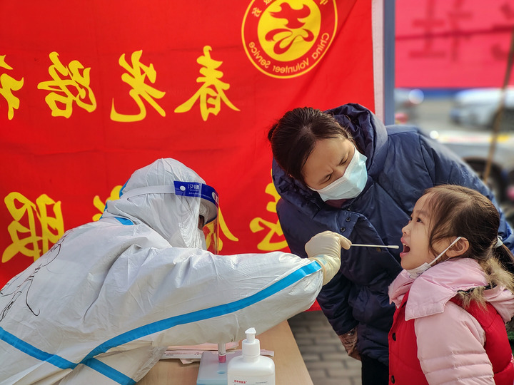 在安阳市文峰区紫薇大道街道春光路社区,医护人员为一名小朋友进行核酸检测取样(1月11日 麻翛然摄)