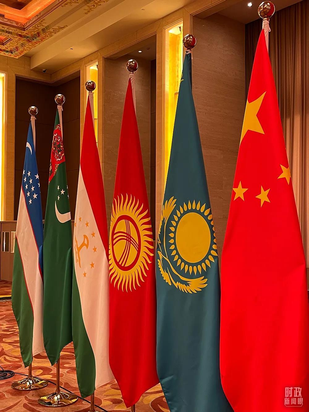 △会场摆放的中国与中亚五国国旗。(总台央视记者赵化拍摄)
