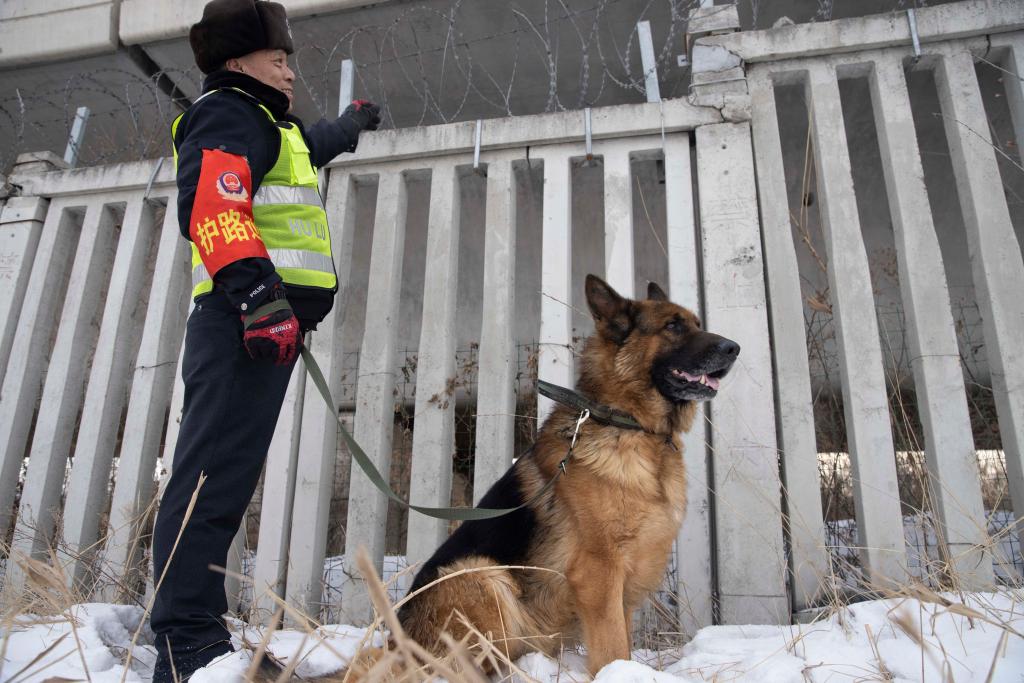 1月24日,巡防员于振龙和虎子在大庆西站附近的哈齐高铁沿线巡查。新华社记者张涛 摄