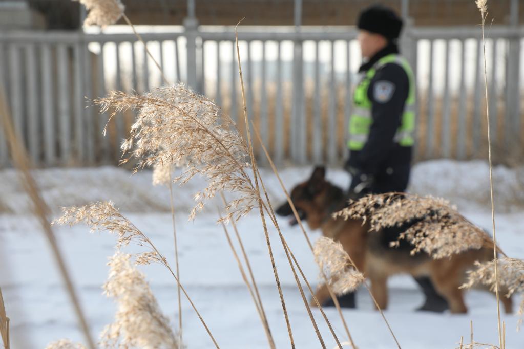 1月24日,巡防员王洪彬和虎子在大庆西站附近的哈齐高铁沿线巡查。新华社记者张涛 摄