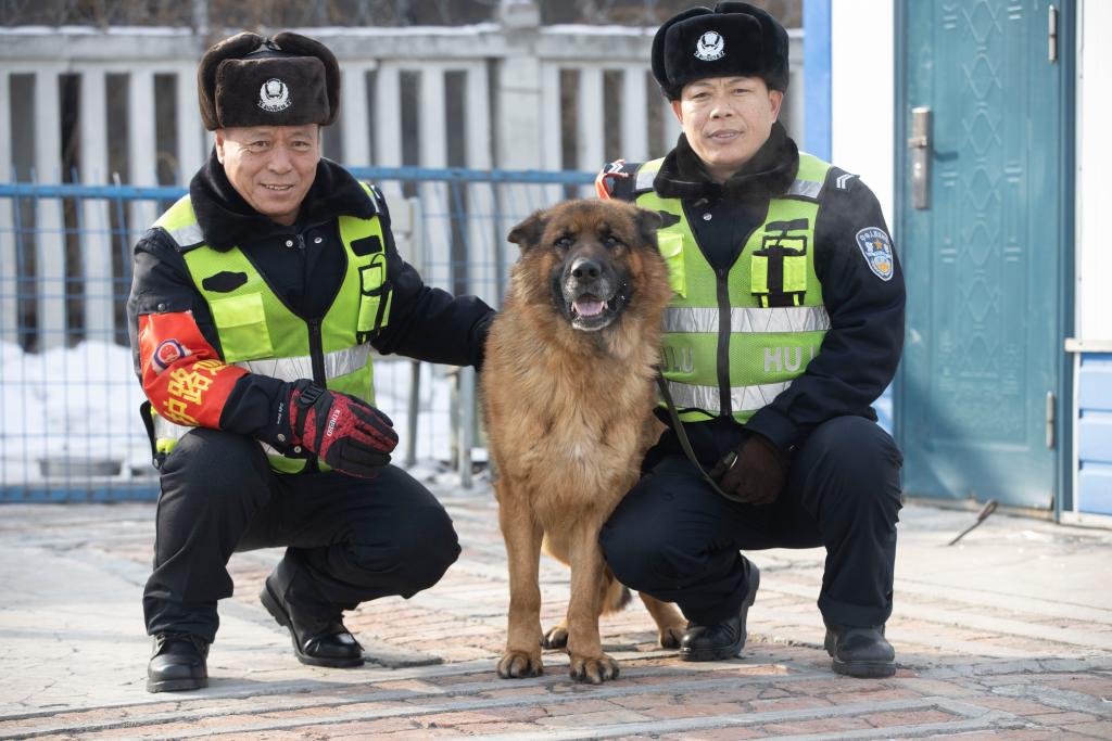 1月24日,在大庆西站附近的巡防岗亭,巡防员王洪彬(右)、于振龙和虎子合影。新华社记者张涛 摄