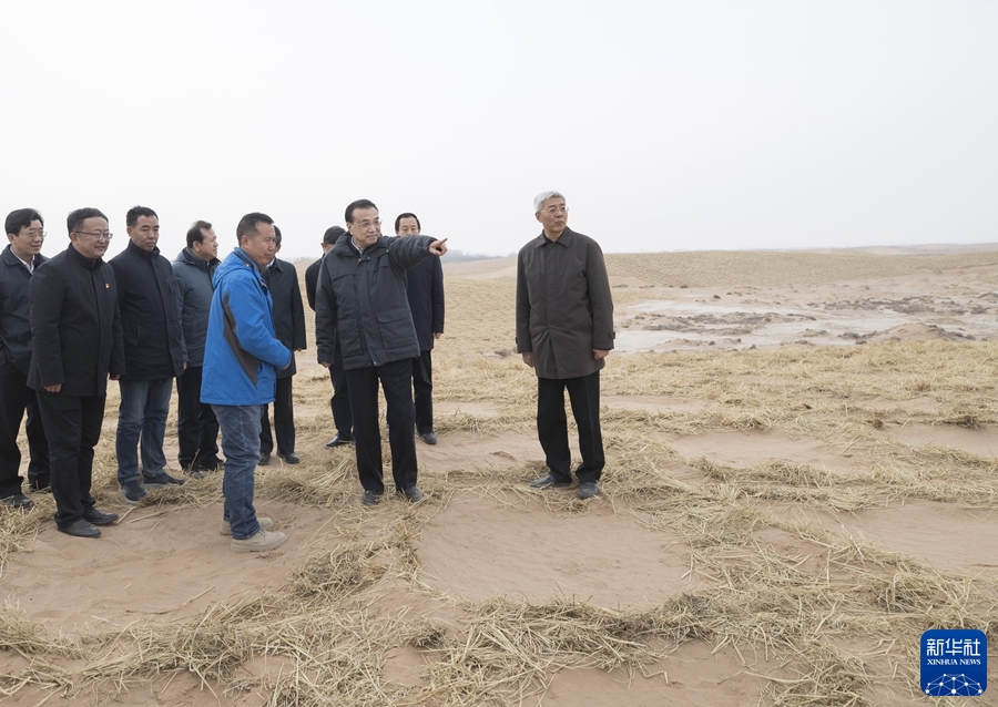 1月27日至28日,春节前夕,中共中央政治局常委、国务院总理李克强在甘肃金昌、武威考察。这是1月27日,李克强在武威市民勤县草方格固沙点听取甘肃防沙治沙工作汇报。新华社记者 王晔 摄