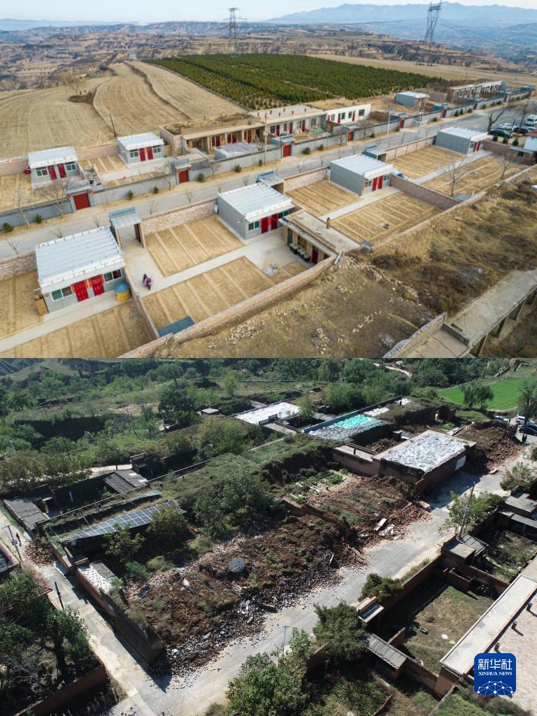 拼版照片:上图是2022年1月拍摄的山西省霍州市师庄乡冯南垣村灾后重建后的场景;下图是2021年10月拍摄的村庄因灾受损的场景。新华社发