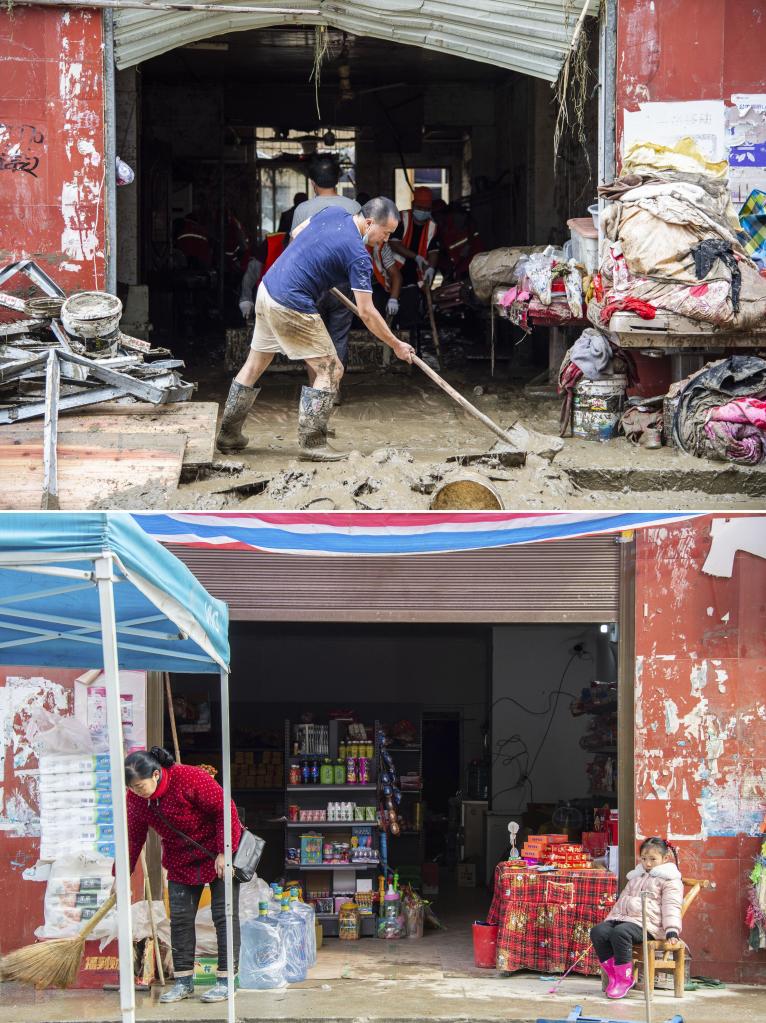 宋凤英一家在镇里主街道上开了一家小超市,去年的那场暴雨冲走了超市里的货品,造成了严重损失。她告诉记者,洪水退去后,救援人员协助清理了淤泥,小超市在去年9月6日重新开张。“如今,店里的生意正在慢慢恢复。今年春节前,政府给我们发了米和油,生活有保障。”宋凤英说。