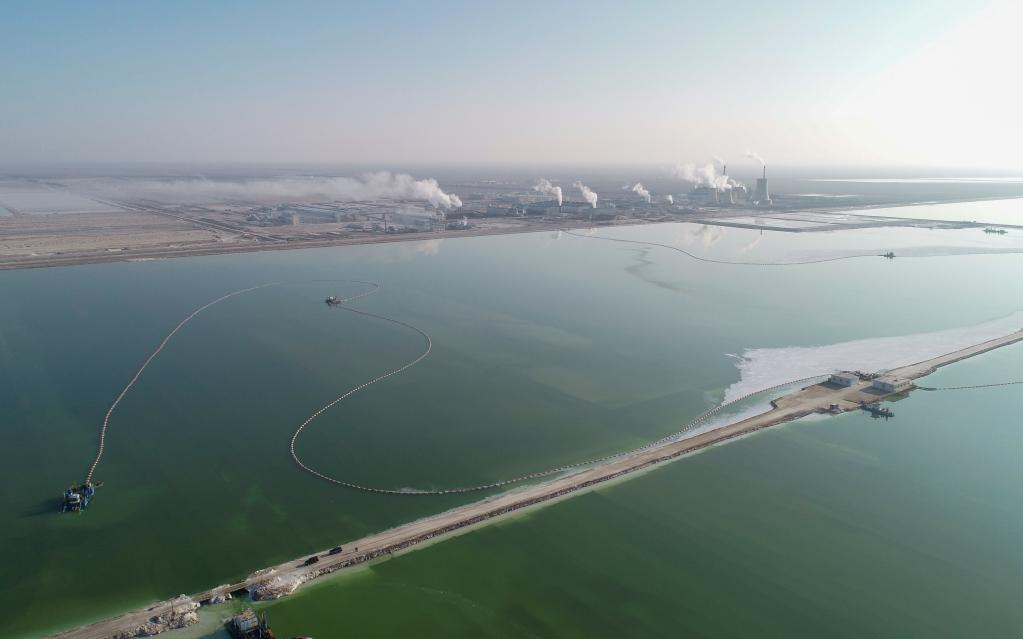 1月25日,在位于罗布泊的一片盐田中,国投新疆罗布泊钾盐有限责任公司的水采机拖拽着浮管宛若一条长长的“尾巴”。新华社记者关俏俏摄