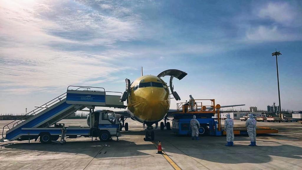 喀什机场工作人员正在对即将飞往巴基斯坦拉合尔的货运包机进行消毒。(图片由受访单位提供)