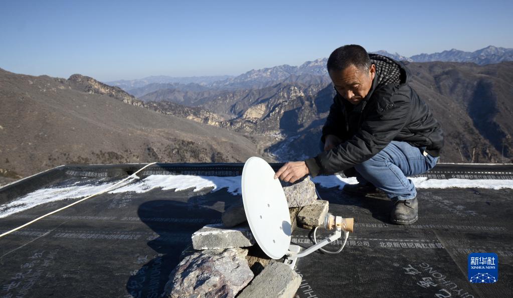 1月27日,孙宝清在骆驼山检查站房顶上调试电视天线。新华社记者 李欣 摄